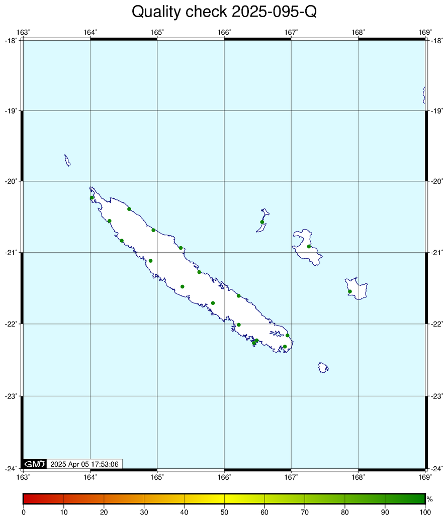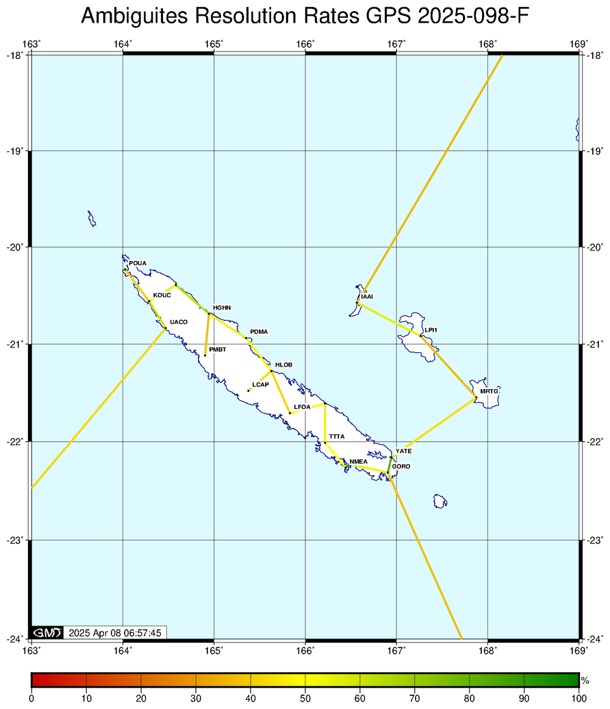 Les stations sont éliminées du calcul si l'écart entre les coordonnées issues du calcul sur le code et les coordonnées initiales est supérieur à dE=10.0 m, dN=10.0 m ou dU=20.0 m| Station | dE (m) | dN (m) | dU (m) |